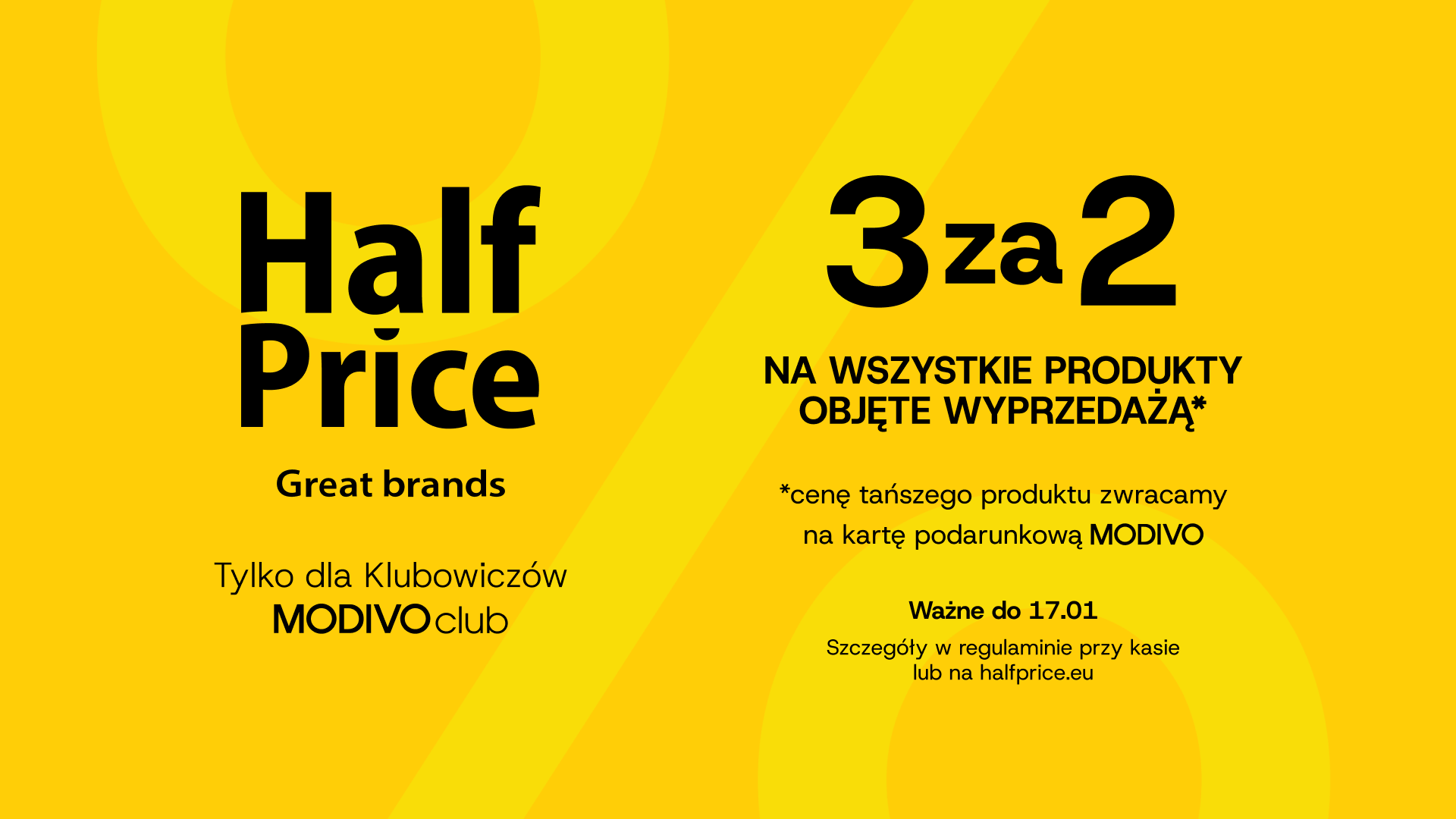 Akcja 3za2 w HalfPrice! Wybierz 3 produkty z wyprzedaży, a zwrot za najtańszy z nich otrzymasz na kartę podarunkową MODIVO! Światowe marki i wyjątkowe ceny czekają!